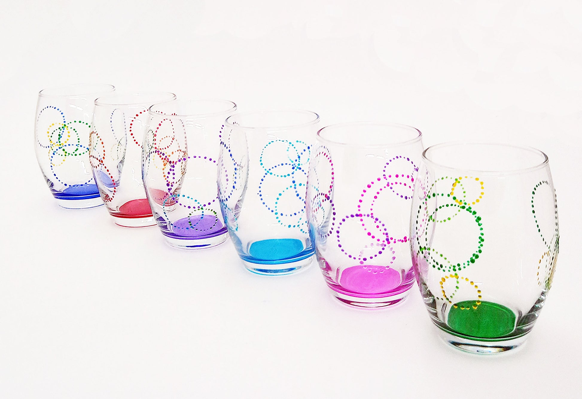 cristallo dipinto a mano con colori a rilievo e fondo dipinto uno per colore : giallo , arancio , rosso , verde , celeste , blu.
